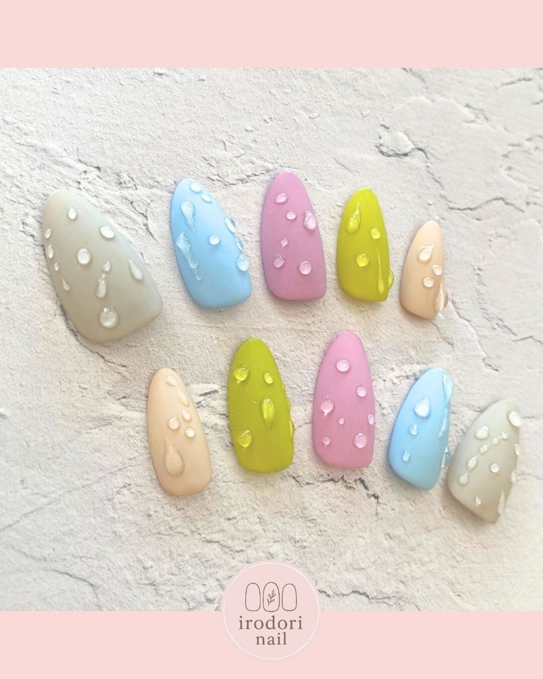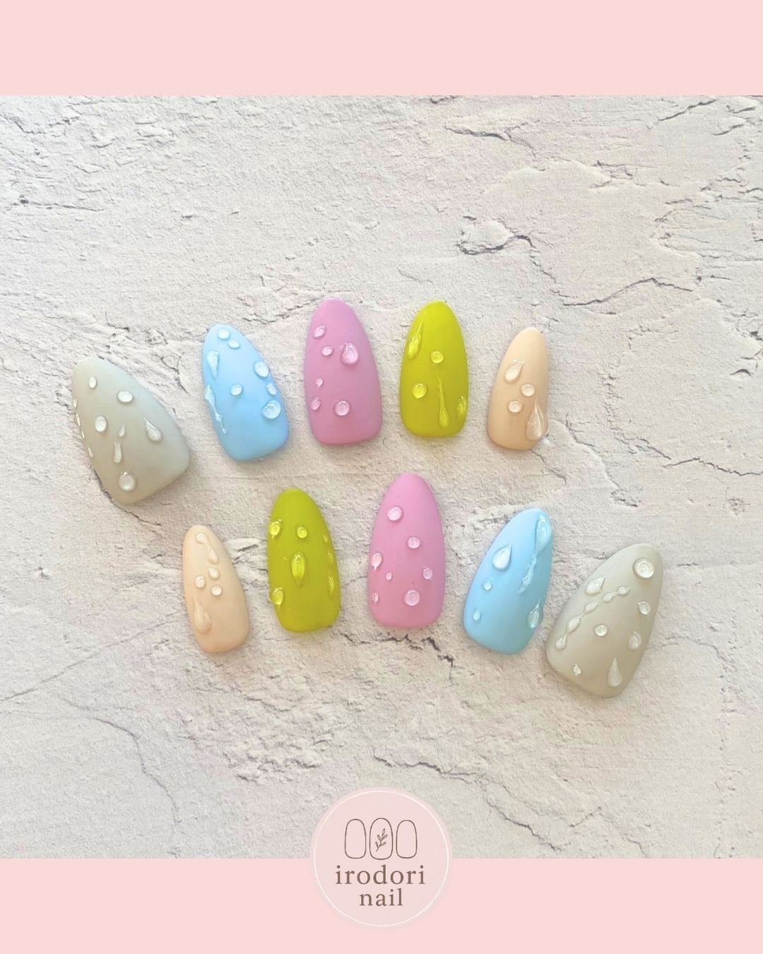 まるで朝露や雨粒が指先に宿ったかのような、繊細で美しい3Dデザインのネイルチップです。優しいパステルカラー(ベージュ、ライトブルー、ピンク、グリーン、ピーチ)が織りなす虹色の世界観で、どんな装いにも上品で可愛らしいアクセントを添えます。