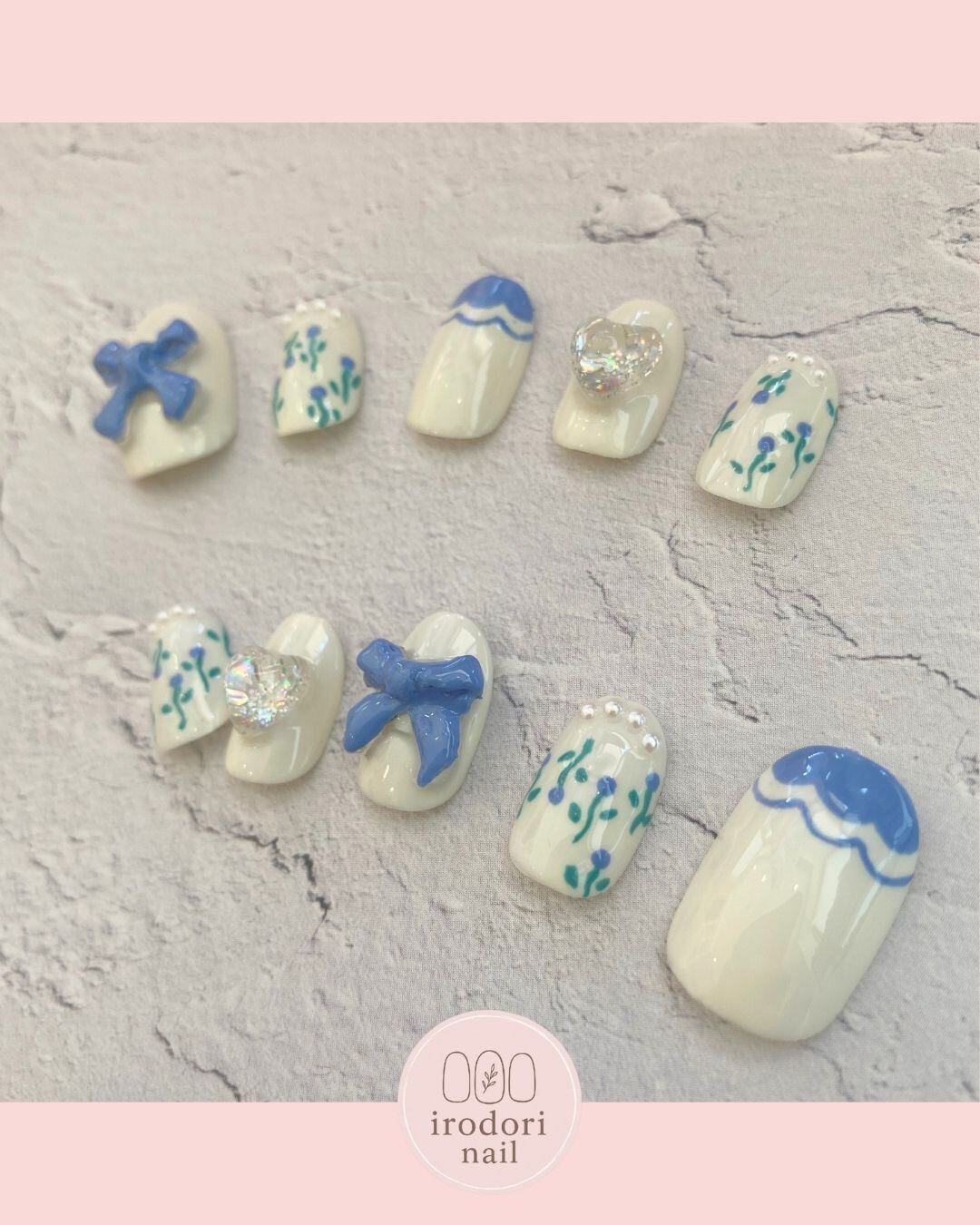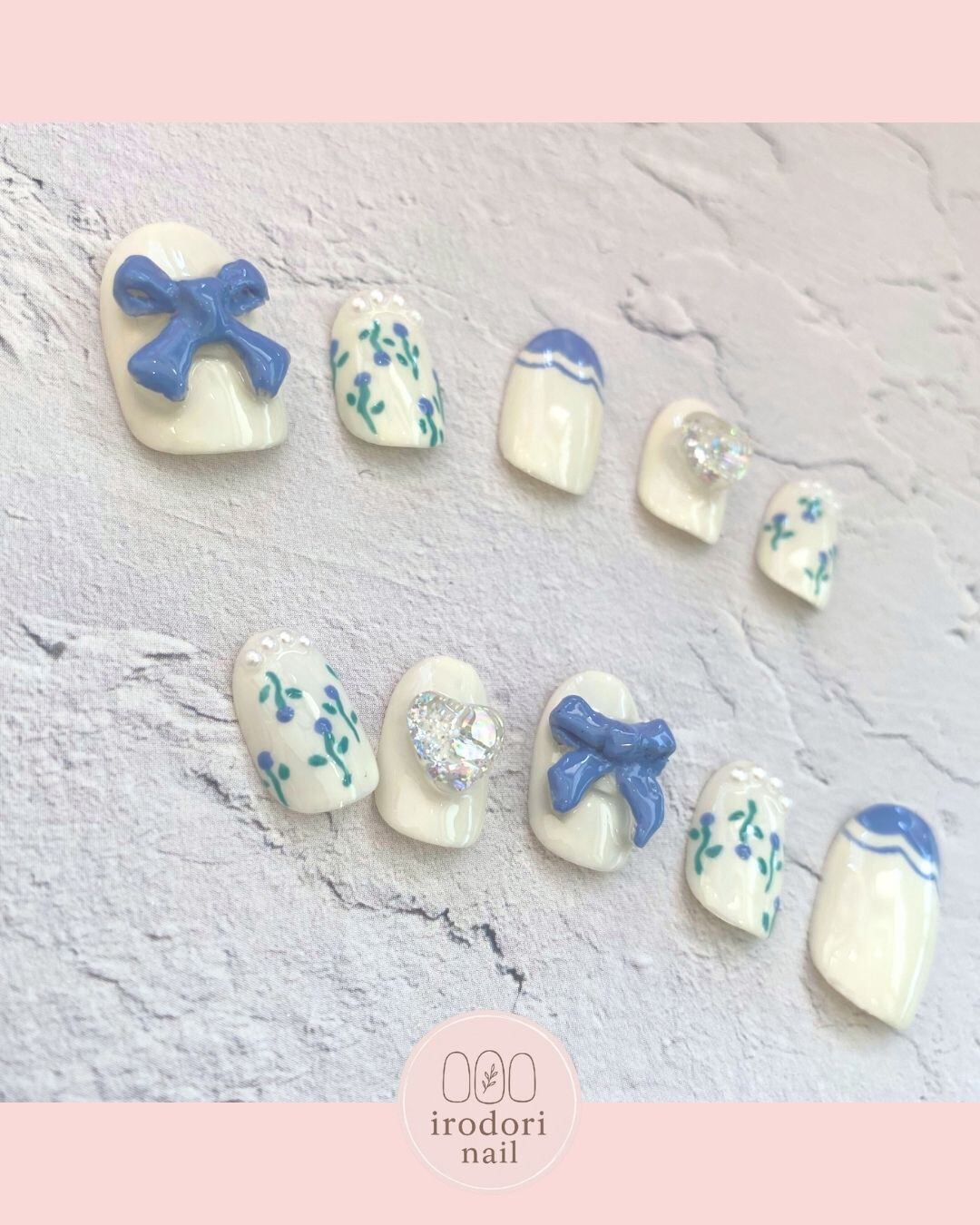 【irodori nail】青いリボン 野の花 レース 陶器 かわいい ネイルチップ ショートオーバル
