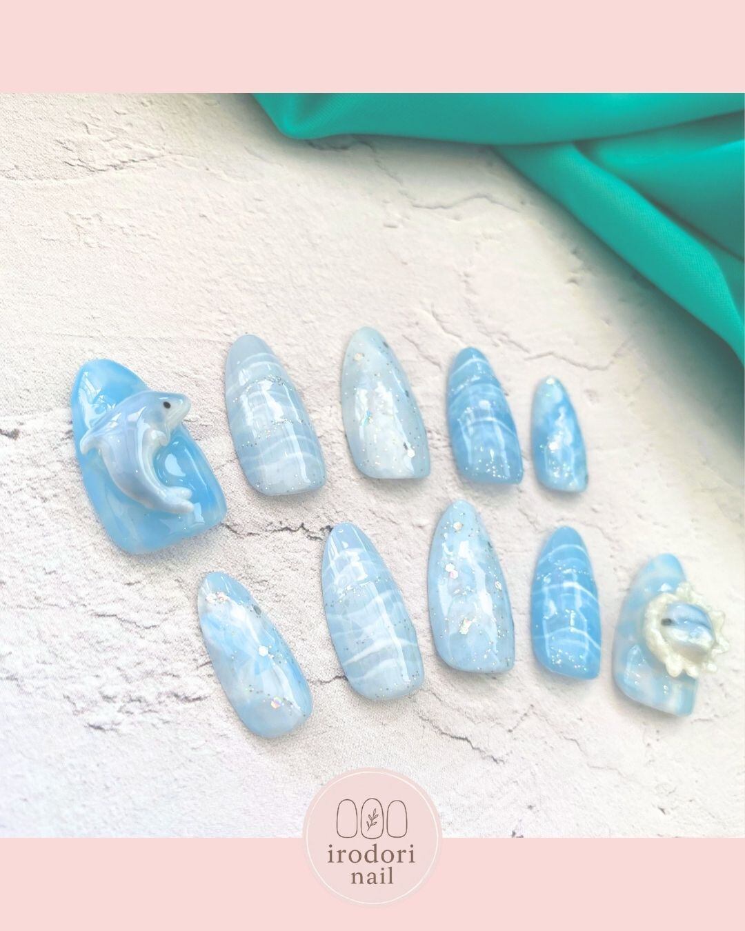 【irodori nail】イルカ ドルフィン 波 水しぶき ネイルチップ スキニーオーバル ポイント