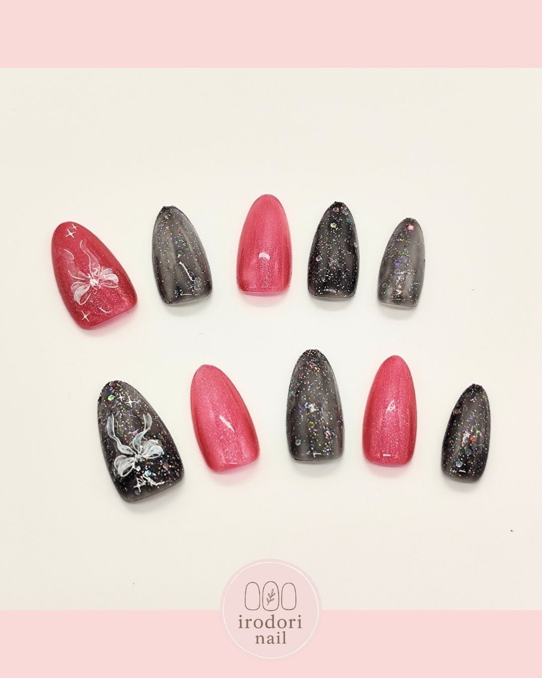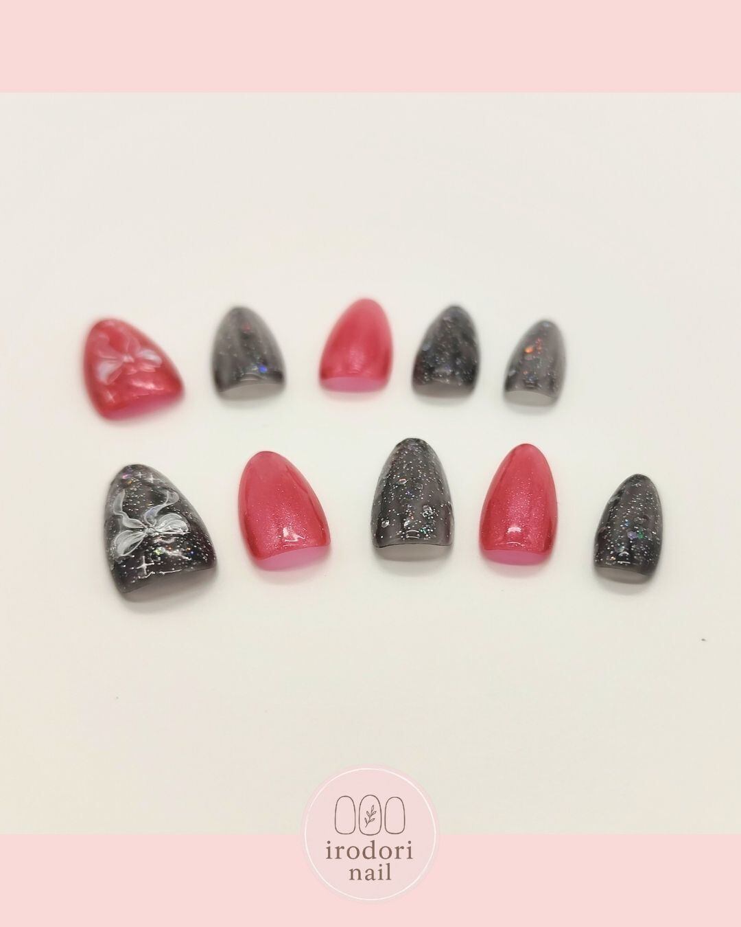 キラキラと輝くグリッターを閉じ込めた深みのあるブラックと、きゅんと心ときめくピンク。 それぞれの指に異なる表情を持たせつつ、手描きの繊細なリボンモチーフが全体を可愛らしくまとめてくれています。