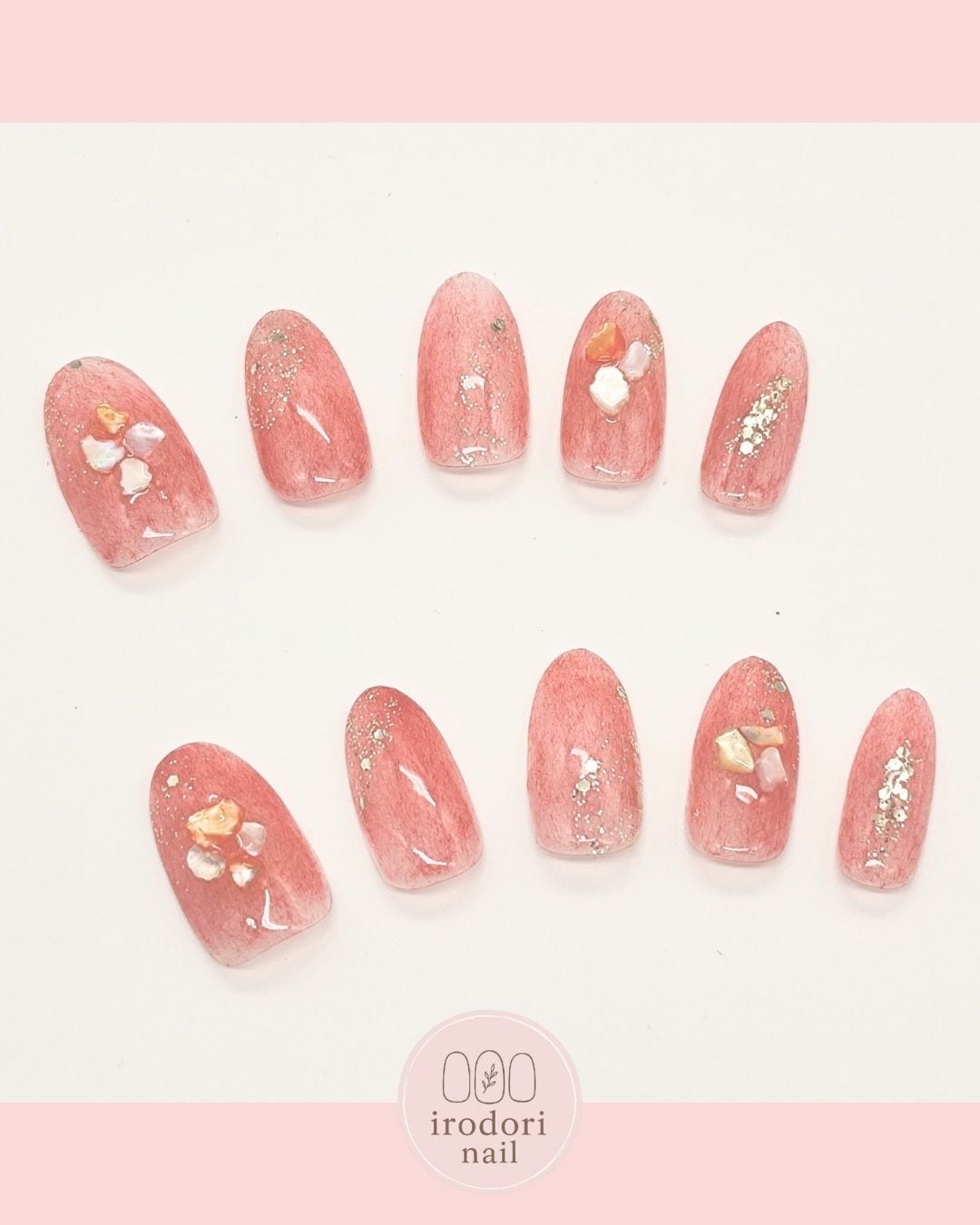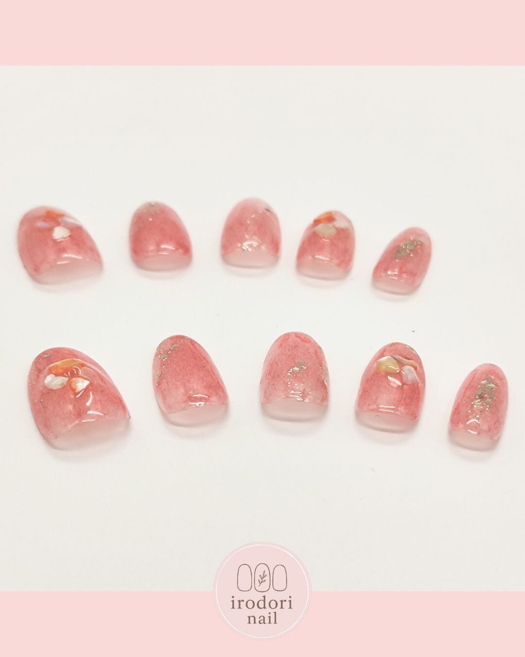 クリア感のあるサーモンピンクのベースに、繊細なゴールドラメとナチュラルなホワイトシェルをあしらいました✨