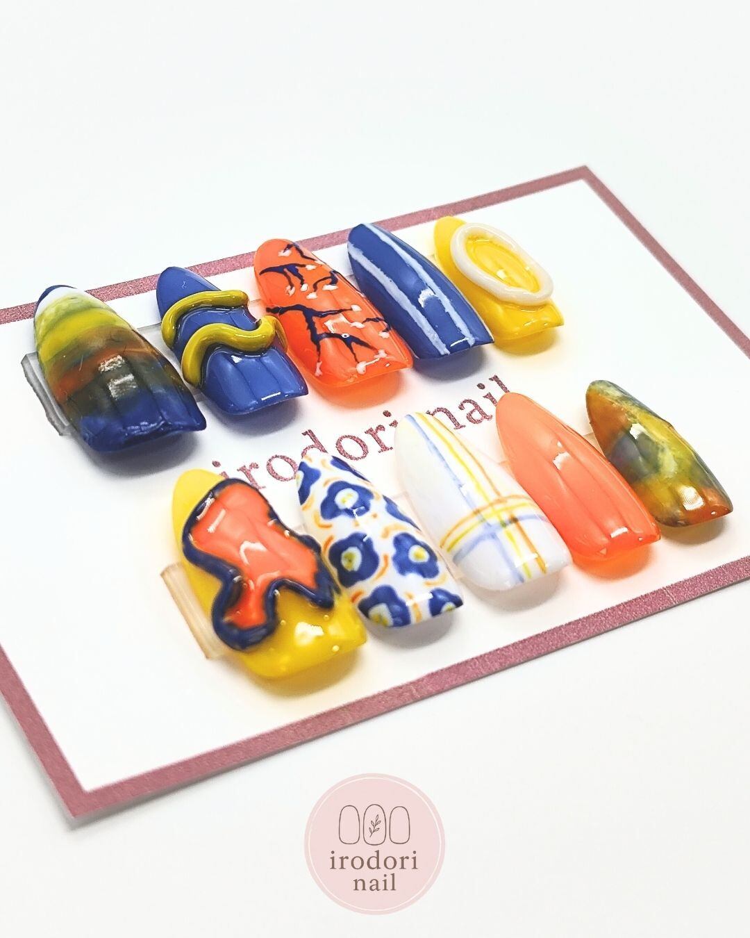 鮮やかなマリンブルー、元気なオレンジ、明るいイエローをベースにしたアーティスティックなネイルチップ。