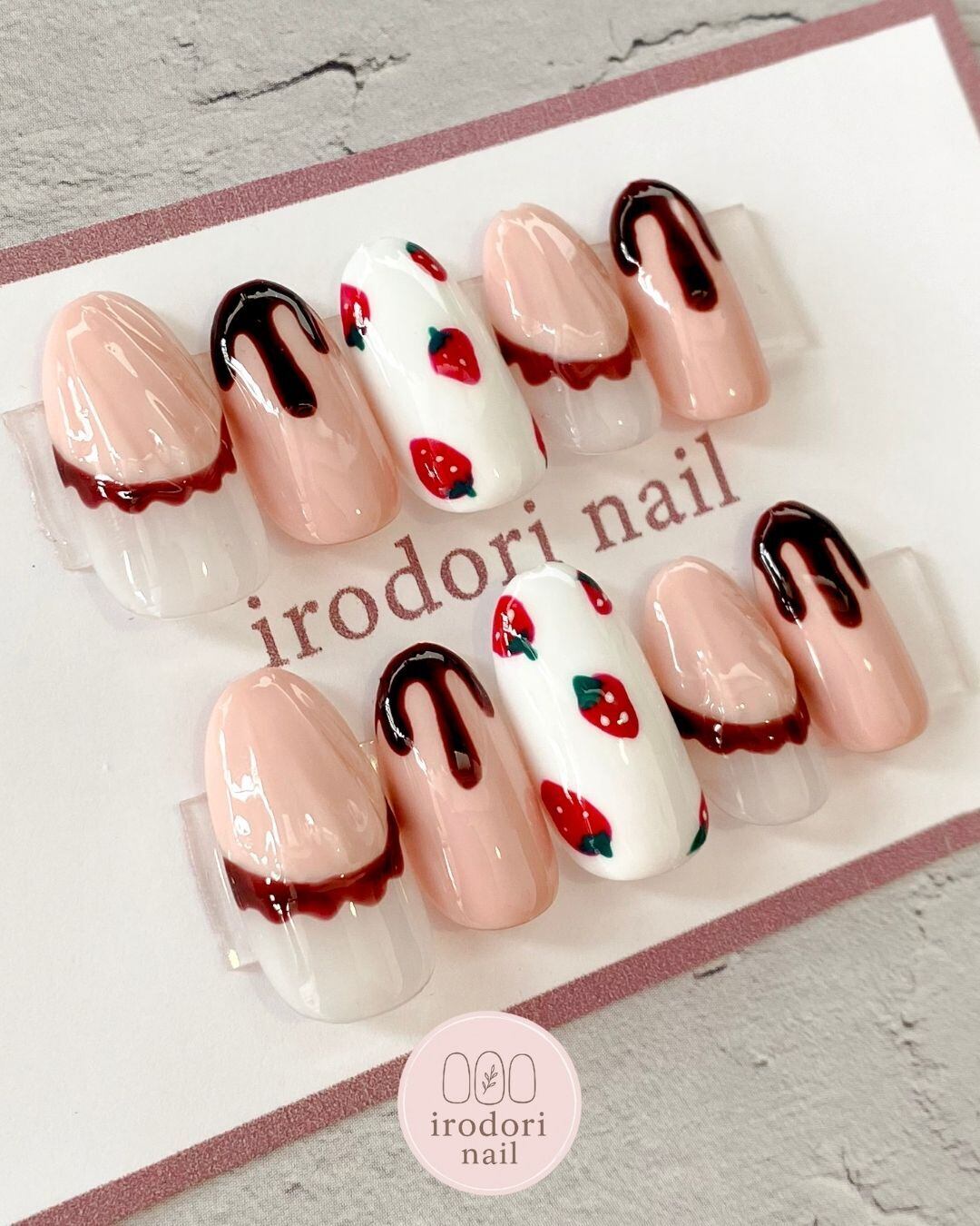 【irodori nail】小さめサイズ バレンタインネイル いちごネイル チョコレートネイル ガーリーネイル 淡色ネイル 大人可愛いネイル ハートネイル 甘めネイル 個性派ネイル ネイルチップ バレンタインデザイン