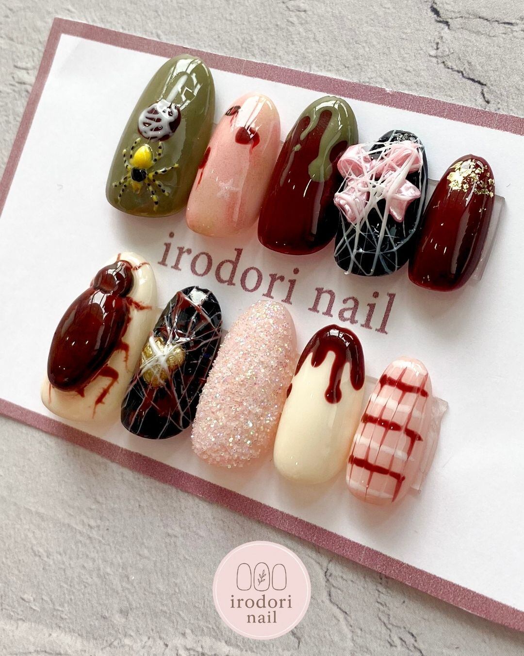 【irodori nail】バレンタインネイル ホラーネイル チョコレートネイル ダークネイル スパイダーネイル クモネイル 流血ネイル 血糊ネイル ゴシックネイル 個性派ネイル 手描きアートネイル ネイルチップ バレンタインデザイン 甘辛ネイル