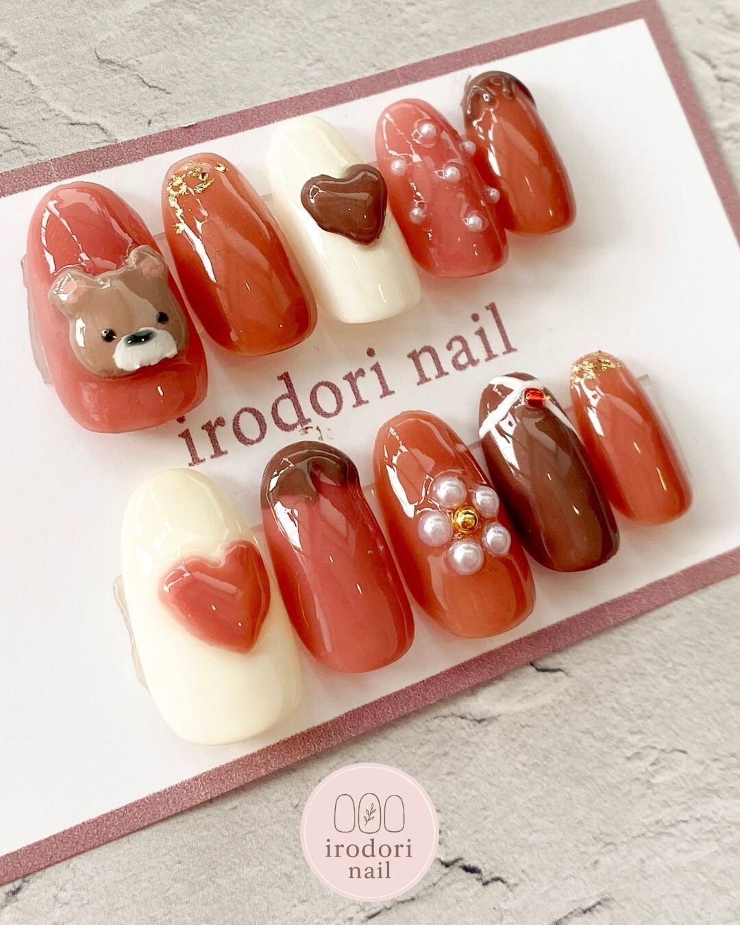 【irodori nail】バレンタインネイル チョコレートネイル くまネイル ハートネイル ブラウンネイル ベージュネイル 大人可愛い ガーリー ネイルチップ 冬ネイル 手描き ハンドメイド