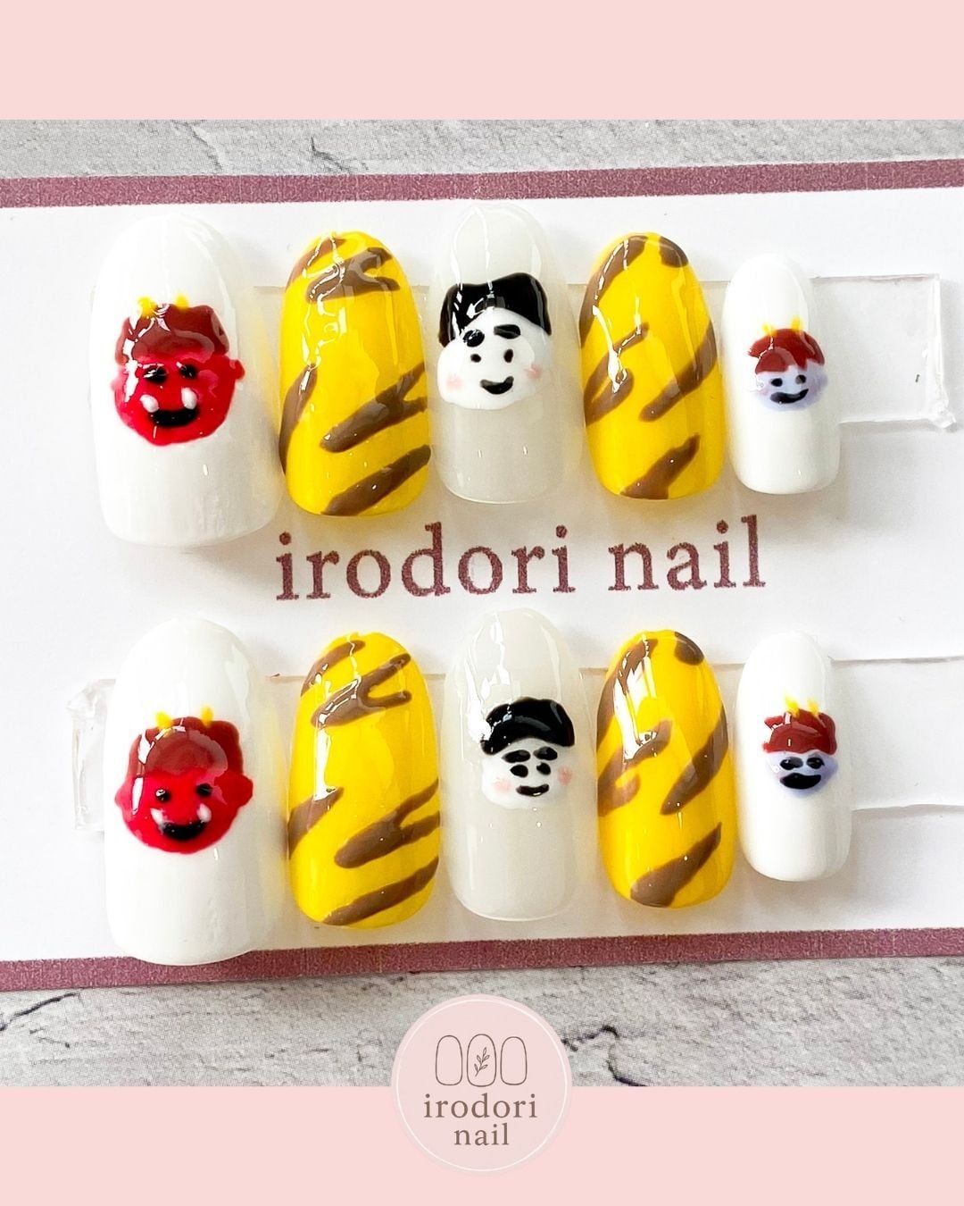 【irodori nail】節分ネイル 鬼ネイル トラ柄ネイル キャラネイル フェイスネイル イエローネイル 和イベントネイル 個性派ネイル ゆるかわ ネイルチップ 手描き ハンドメイド 冬ネイル