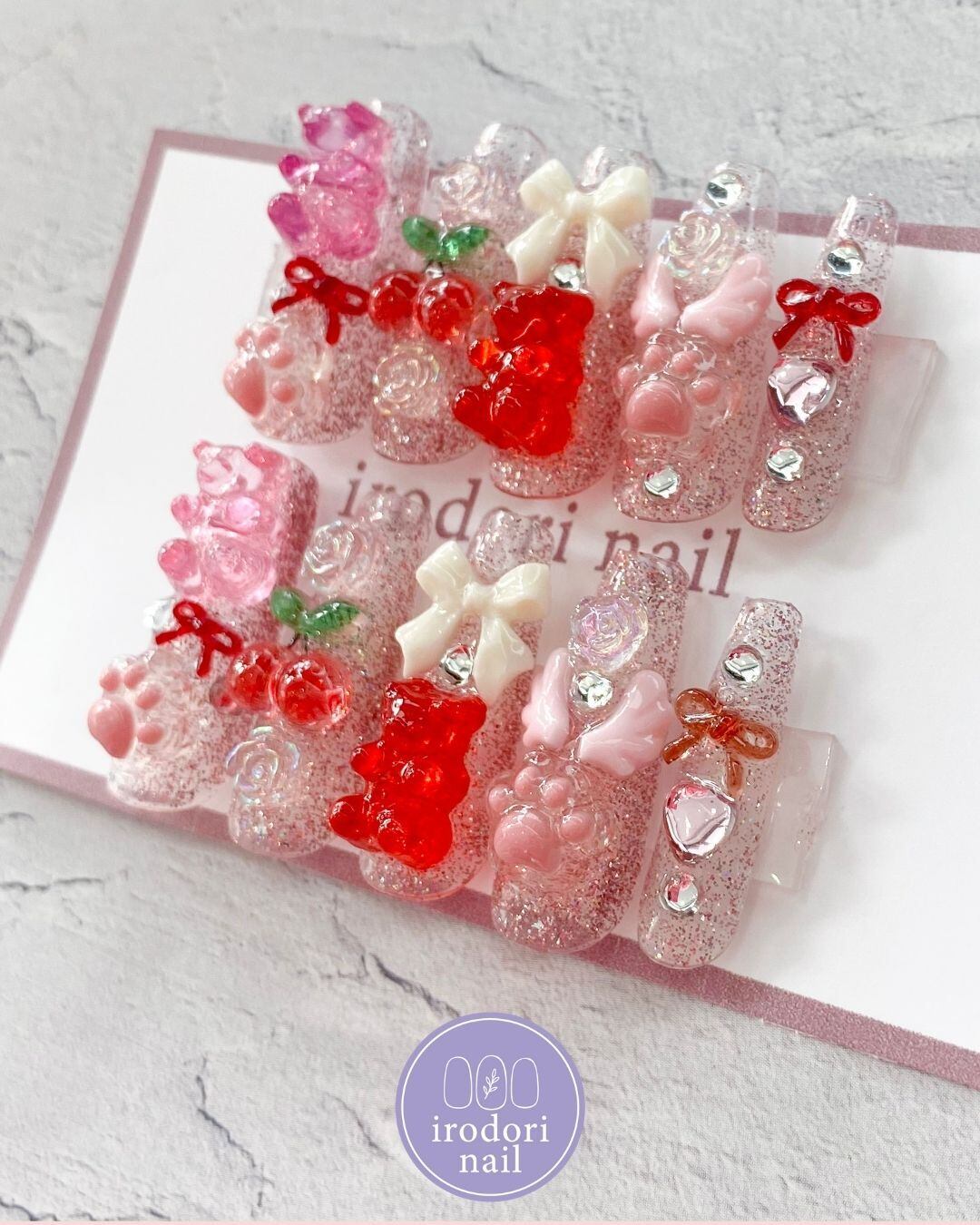 【irodori nail】キッズネイルチップ ゆめかわネイル ぷっくりネイル グミネイル くまネイル さくらんぼネイル リボンネイル クリアピンク 立体ネイル ガーリーネイル 子どもネイル ハンドメイドネイル
