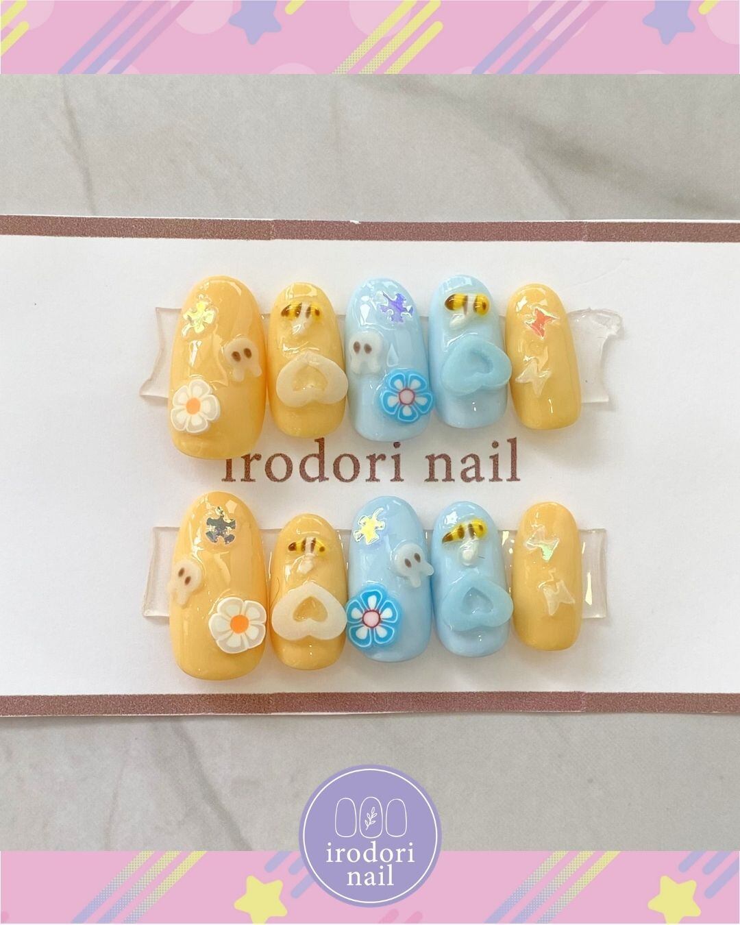 【irodori nail】キッズイエローブルーはちネイル(親子)キッズネイル 3Dネイル ハンドメイドネイル ネイルチップ