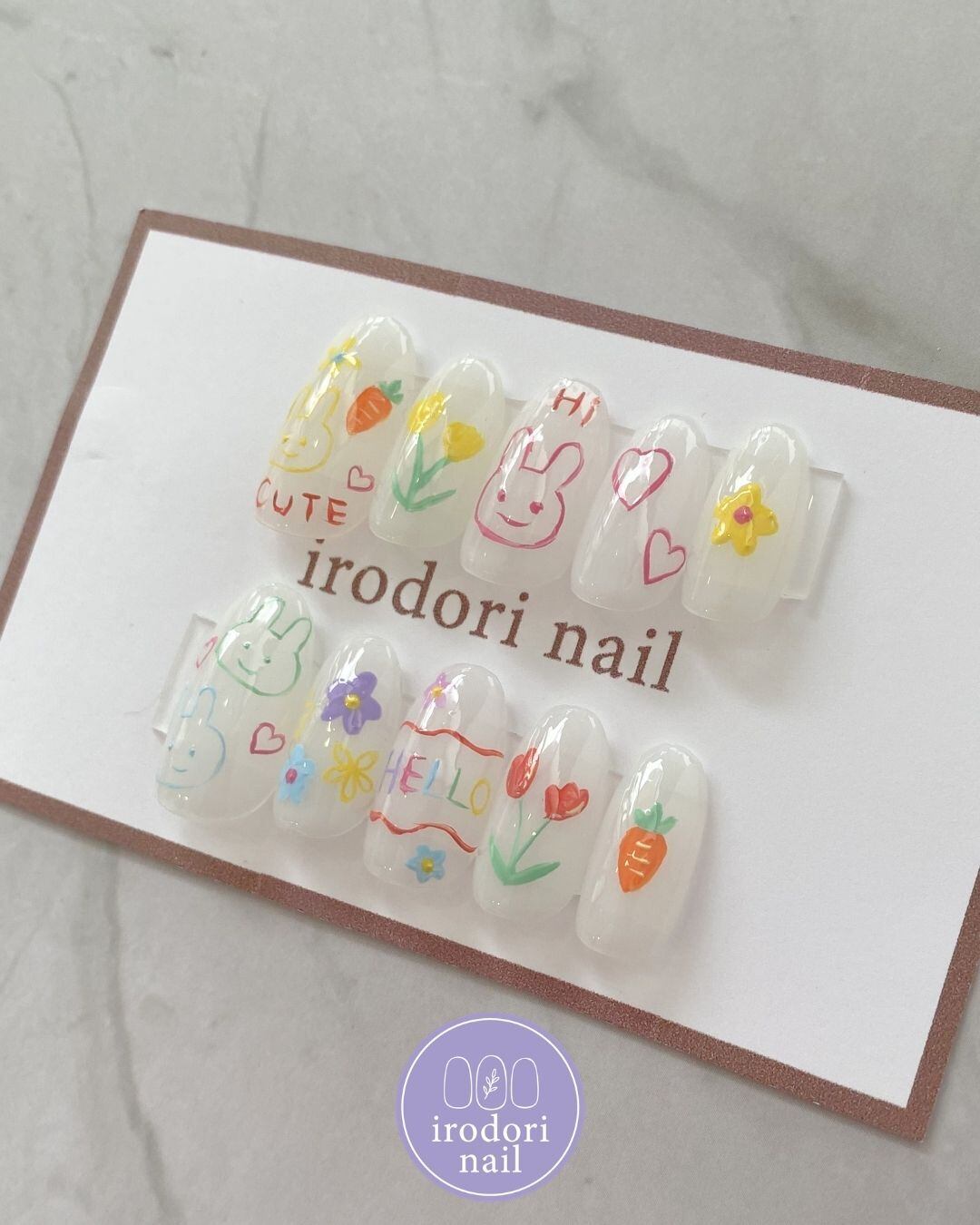 【irodori nail】 キッズお絵描きネイル カラフル アシンメトリー うさぎ チューリップ にんじん ハンドメイドネイル ネイルチップ