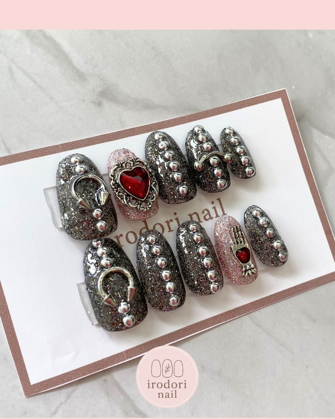 【irodori nail】ゴシックパンクネイル 地雷系ネイル サブカルネイル ボディピアス風 メタリックパーツ シルバーネイル ハートビジュー キラキラネイル 闇可愛い / パンクスタイル 個性派ネイル つけ爪 ネイルチップデザイン