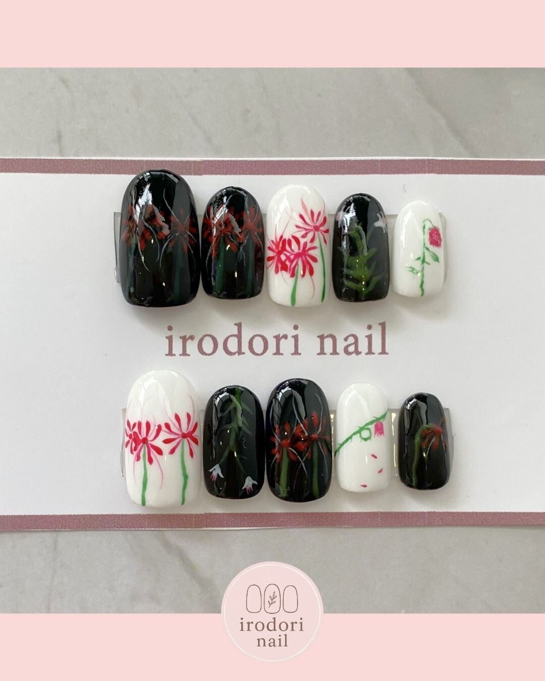 【irodori nail】彼岸花ネイル 曼珠沙華 和柄ネイル モノトーン 手描きアート 季節のネイル 凛とした指先 ネイルチップ販売 お出かけネイル 妖艶 和装ネイル 秋の訪れ